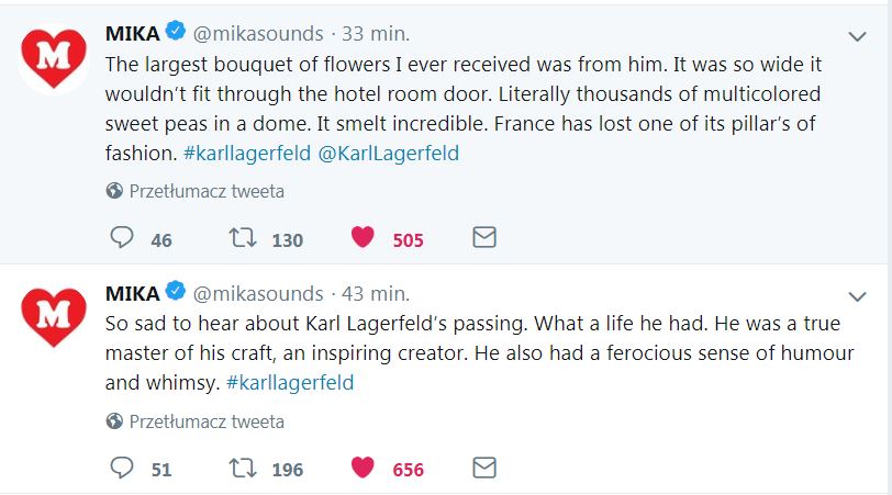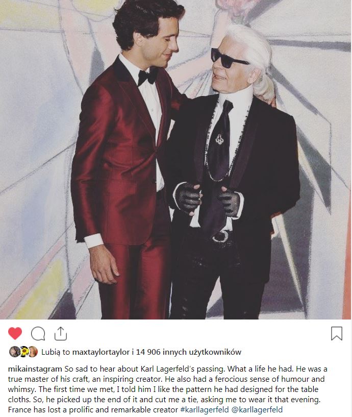 Dziś obiegła świat wiadomość o śmierci Karla Lagerfelda – ikony mody, dyrektora domu Chanel. Mika zamieścił kilka wpisów na Twittere i Instagramie, wspominając swoje spotkania z nim.