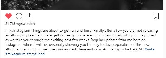 Mika zamieścił długie (prawie cała minuta) nagranie na Instagramie.