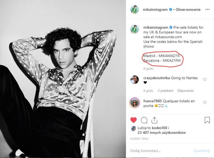 Dziś i jutro (5-6 czerwca) można zamówić bilety w tak zwanej „przedsprzedaży”. Mika podał dwa kody, aby można było zakupić bilety na koncerty w Madrycie i Barcelonie.