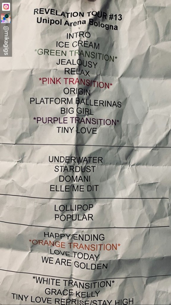 „Jednym z moich ulubionych momentów w Genewie była piosenka „Underwater” i myślę, że to wykonanie było nawet lepsze niż zwykle. Część piosenki musi zostać poświęcona, aby bawić publiczność, ale zawsze tak jest z „Underwater”. światełka na widowni wyglądają pięknie i sprawiają, że Mika się uśmiecha. Mika był w świetnej formie i podziwiałam to, ponieważ musiał być dość zmęczony. Trasy koncertowe są męczące. Są męczące nawet dla mnie, choć ja po prostu oglądam i cieszę się. Ucieszyłam się, widząc story Miki na Instagramie (patrz powyżej) i wiedząc, że podróżuje razem z rodziną. Dzięki temu na pewno jest mu łatwiej”.