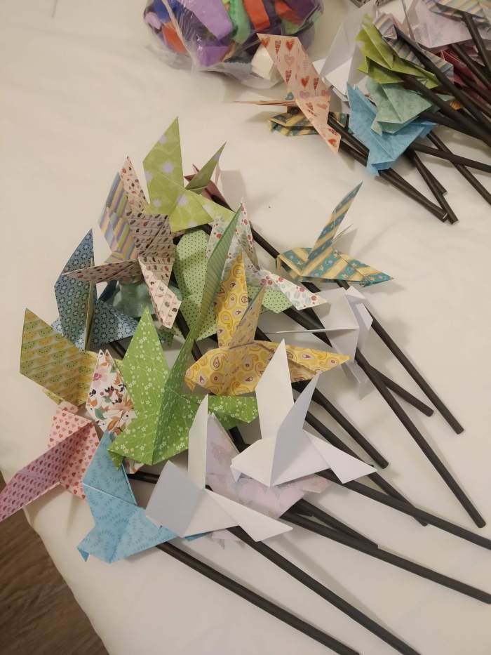 Wróciłam z Lille wczoraj wieczorem. Perturbacje z opóźnionymi samolotami i anulowanymi pociągami nie przeszkodziły mi dotrzeć do Lille. Choć mało brakowało, a utknęłabym na lotnisku w Paryżu. Zdążyłam wsiąść do ostatniego pociągu, jaki odjeżdżał w sobotę do Lille na dwie minuty przed odjazdem! Uff. Po godzinie jazdy, o 20tej wieczorem byłam na miejscu. W hotelu szybko rozpakowałam walizkę, żeby jeszcze przygotować gadżety na „fan action”. Zaplanowaliśmy dwie akcje: do piosenki Paloma – gołębie origami z kolorowego papieru i pompony z marszczonej bibuły do „Platform Balerinas”. Ponieważ miałam tylko bagaż podręczny, ukończone przedmioty po prostu nie zmieściłyby się do mojej małej walizki. Więc papier origami złożyłam tylko częściowo. Po ukończeniu gołębi musiałam jeszcze dokleić „patyczki”, tzn. papierowe słomki do napojów. Z pomponami było więcej pracy, bo miałam jedynie pociętą na paski bibułę. Musiałam ją jeszcze porozcinać na krótsze paski i związać sznurkiem. Ogólnie mówiąc cały wieczór w sobotę i przedpołudnie przed niedzielnym koncertem spędziłam na robótkach ręcznych w pokoju hotelowym. Efekt końcowy: 30 pomponów i 70 gołębi. Ogólnie z innymi fanami udało nam się przygotować około 400 pomponów i ponad 1’000 gołębi! Tak, proszę państwa. Fani Miki nie znają limitów 🙂 Prawie wszystkie gadżety rozdaliśmy przed wejściem do hali Zenith de Lille na kilka godzin przed koncertem.