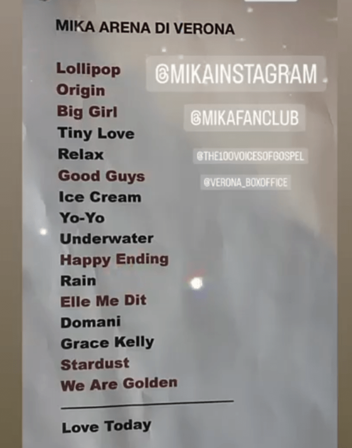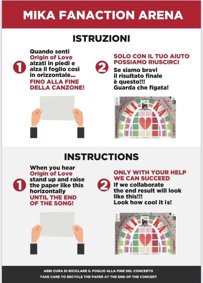 Origin of Love – fanki z Włoch przygotowały niesamowitą akcję, starając się ułożyć w części sali na parterze flagę włoską z wielkim czerwonym sercem po środku (na końcu tego wpisu znajdziecie zdjęcie ulotki, na której widać, jaki miał być efekt końcowy). W dalekich rzędach amfiteatru miał ukazać się czerwony napis MIKA. Niestety nie udało się osiągnąć zaplanowanego efektu ponieważ promotorzy koncertu postanowili zrobić swoją „akcję” i rozdali wszystkim wchodzącym duże białe kartki z napisem GOOD GUY. To miała być akcja do tej właśnie piosenki, ale widzowie pogubili się i zamiast unieść białe, zielone i czerwone arkusze przy Origin Of Love, podnosili cokolwiek wpadło im w ręce. A najczęściej była to kartka GOOD GUY. Mika był tym trochę zdziwiony, ale po koncercie w rozmowie z fanami powiedział, że widział coś na kształt czerwonego serca.