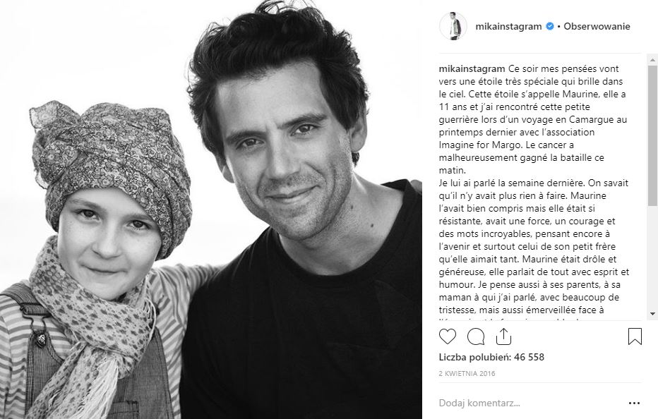 Od roku 2015 Mika jest twarzą kampanii prowadzonych przez asocjację. Wielokrotnie spotykał się z chorymi dziećmi, z których część już nie żyje. Za każdym razem, gdy odchodzi dziecko, w organizacji mówi się, że na niebie zaświeciła nowa gwiazdka. Na zdjęciach poniżej wpisy Miki na Instagramie. Na pierwszym Mika i Clement, który znalazł się na plakatach reklamujących organizację. Wpis Miki zaczyna się od słów: „Na niebie zaświeciła nowa gwiazdka…” A potem dodaje ; ” Clement, chciałbym mieć takiego syna jak ty. Dziękuję ci za lekcje miłości i siły, jaką nam dawałeś”. Kilka miesięcy później kolejny wpis :” Dziś myślę szczególnie o gwiazdce, która zabłysła na niebie. Ta gwiazdka ma na imię Maurine i ma 11 lat…”