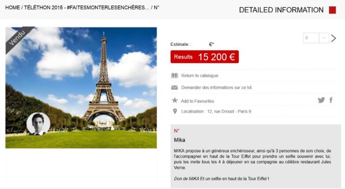 W roku 2015 Mika znów bierze udział w Telethon. I nie tylko śpiewa. Znów proponuje coś do licytowania. Tym razem jest to zaproszenie dla osoby, która wygra licytację plus trzy osoby towarzyszące, na wspólne śniadanie w restauracji na wieży Eiffela plus pamiątkowe selfie.