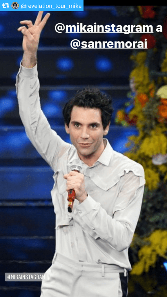 Tegoroczny, siedemdziesiąty festiwal piosenki włoskiej w Sanremo odbywa się w dniach od 4 do 8 lutego. Mika został zaproszony jako gość specjalny i wystąpił wczoraj, 6 lutego. Obecnie koncerty odbywają się w dwóch miejscach: na zewnątrz na Piazza Colombo, gdzie Mika zaśpiewał „Relax” oraz „Ice Cream” i w Teatro Ariston, gdzie Mika wykonał „Dear Jealousy” i „Happy Ending” z udziałem francuskiego chóru „100 voices of Gospel” oraz włoską piosenkę „Amore che vieni, amore che vai” z repertuaru Fabrizio de Andre.